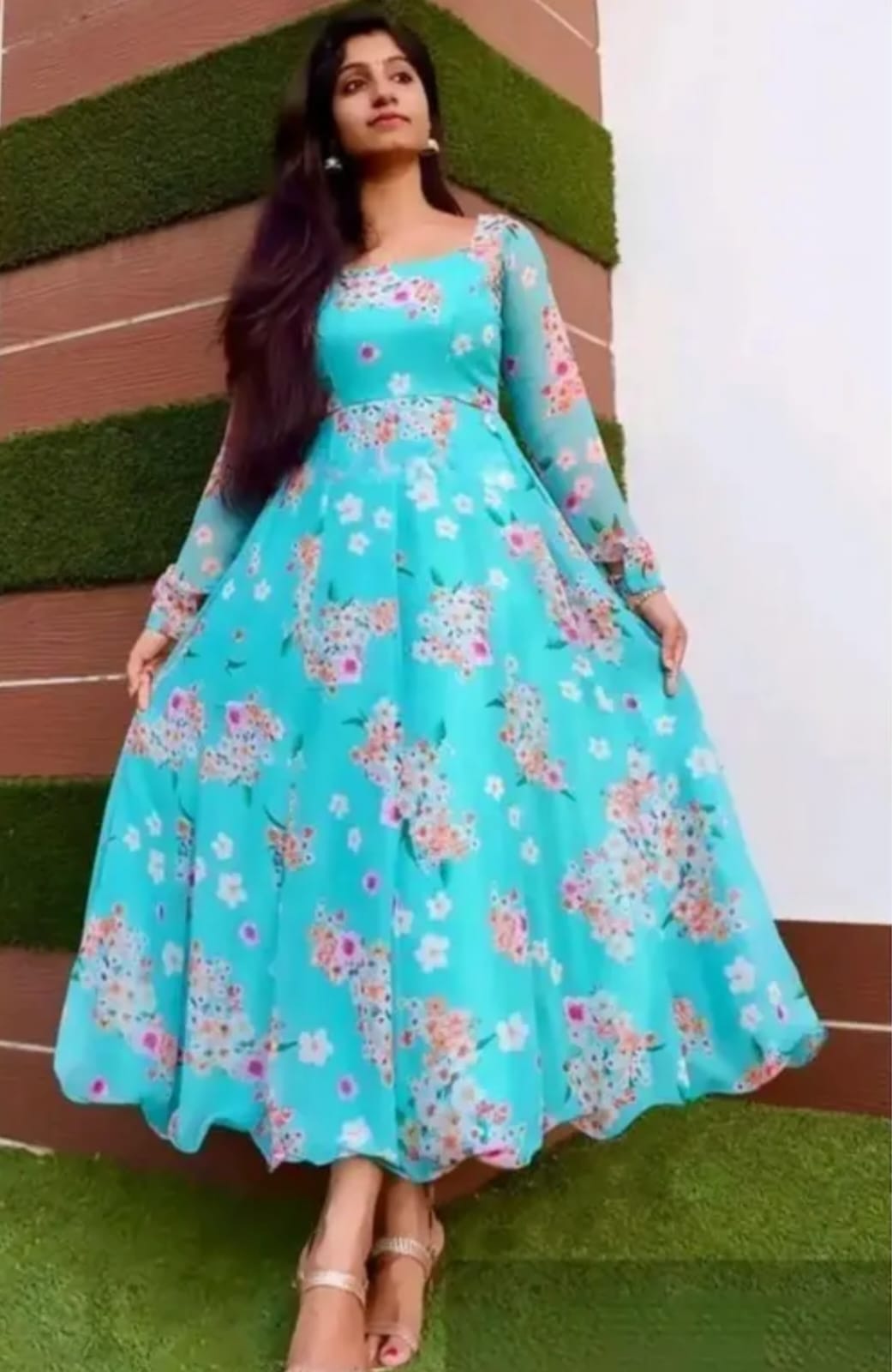 Add a touch of style and comfort to your wardrobe with this Designer Printed Kurti in soothing aqua blue. Made from soft and breathable poly georgette fabric, this kurti feels light on the skin and flows beautifully, making it ideal for both daily wear and special occasions.